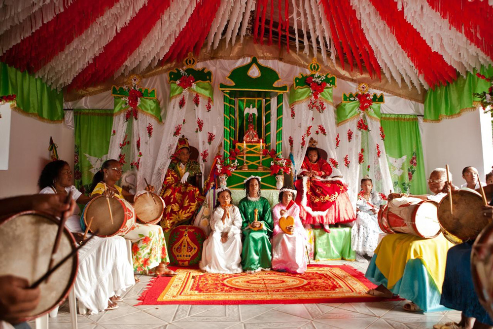 Sempre me encanto pela motivação intrínseca que vivem essas pessoas em estado de doação física, espiritual e até financeira. Passam meses em preparos intensos, gastam um dinheiro que não têm para que a festa esteja à altura do que é preciso celebrar, e isso sem o desejo de mostrar para plateias, mas para viverem o terreiro, esse chão de terra circular que carrega a intimidade do coletivo. Uma inspiração profunda para quem se sente desgarrado do tempo, do grupo e das tradições. E a criança lê isso com toda verdade que essas características têm. É a “verdade verdadeira” instaurada a céu aberto e a criança sente isso.